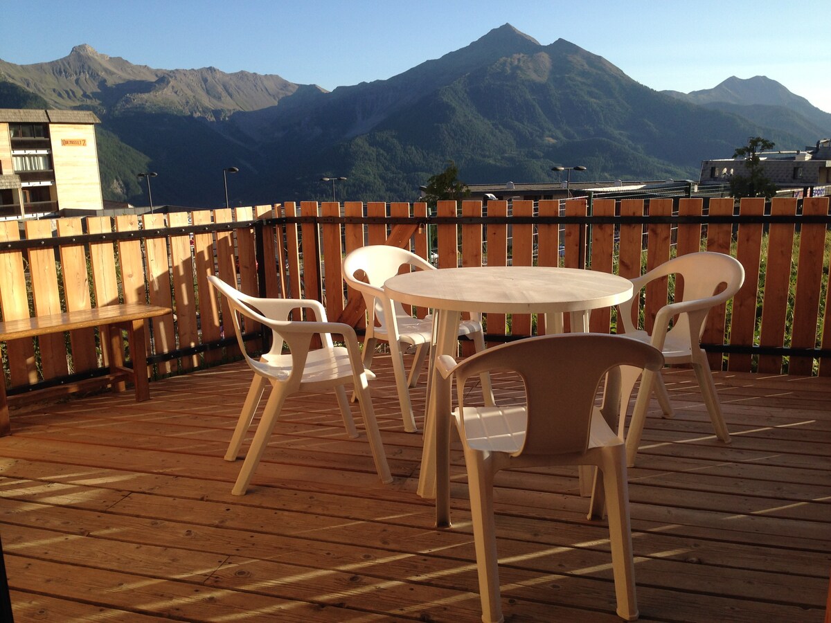 Grand studio rénové de 30M2 plein centre station les Orres 1650.Pistes au pieds, très calme donnant sur les montagnes avec vue sur la vallée,la forêt de la Mazelière, le lac de Serre ponçon.Le plus de cet appartement est sa grande terrasse au calme de 12 M2, agréable aussi bien en hiver qu’en été,où vous pourrez profiter du soleil à partir de Midi. Une fois installé sur place vous n’aurez plus besoin d’utiliser votre voiture. Vous pourrez accéder à toutes les commodités au pied de la résidence