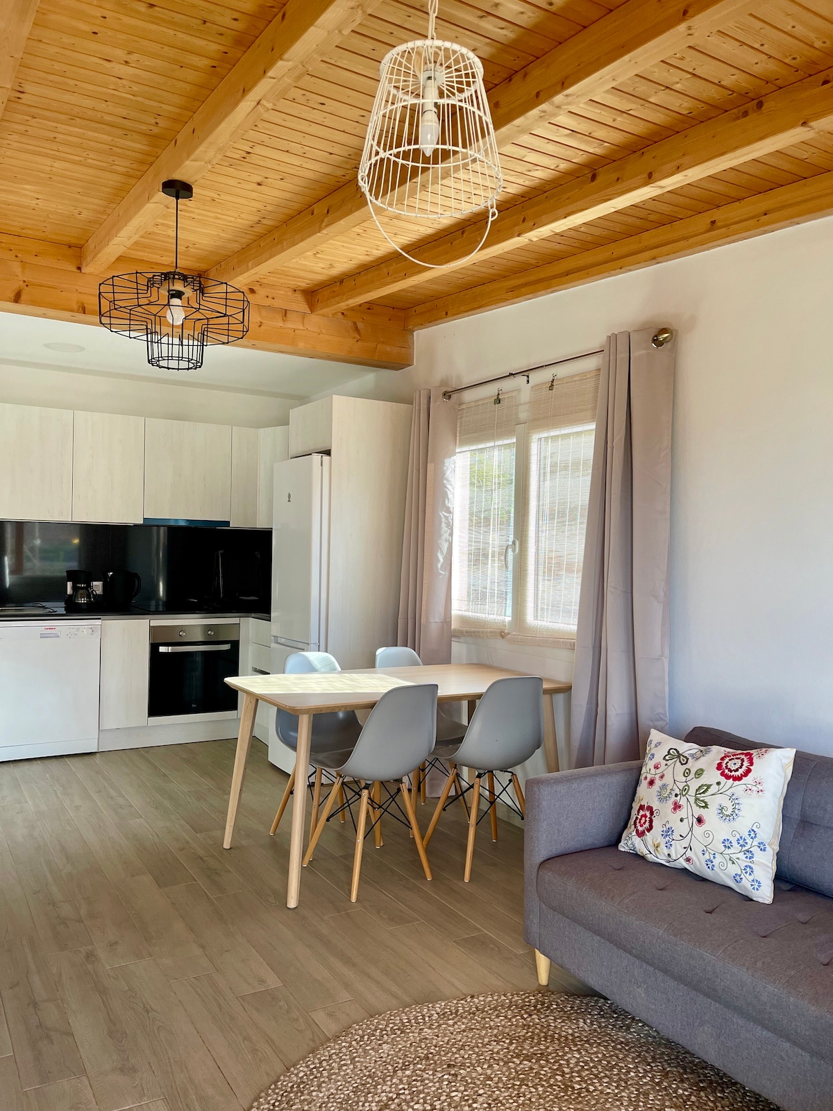Mini apartamento con cocina completa y amplia con espacio de almacenaje. Varios electrodomésticos como tostadora, batidora y calentador de agua. El microondas trae función de horno y la placa es de inducción eléctrica. Utensilios de cocina y menaje incluidos. El baño dispone de una ducha amplia y lavadora. La mesa comedor interior es para dos personas además de la terraza. Hay disponible una mesa en el exterior comunitaria cerca del jardín. Aparcamiento en la misma calle justo al lado.