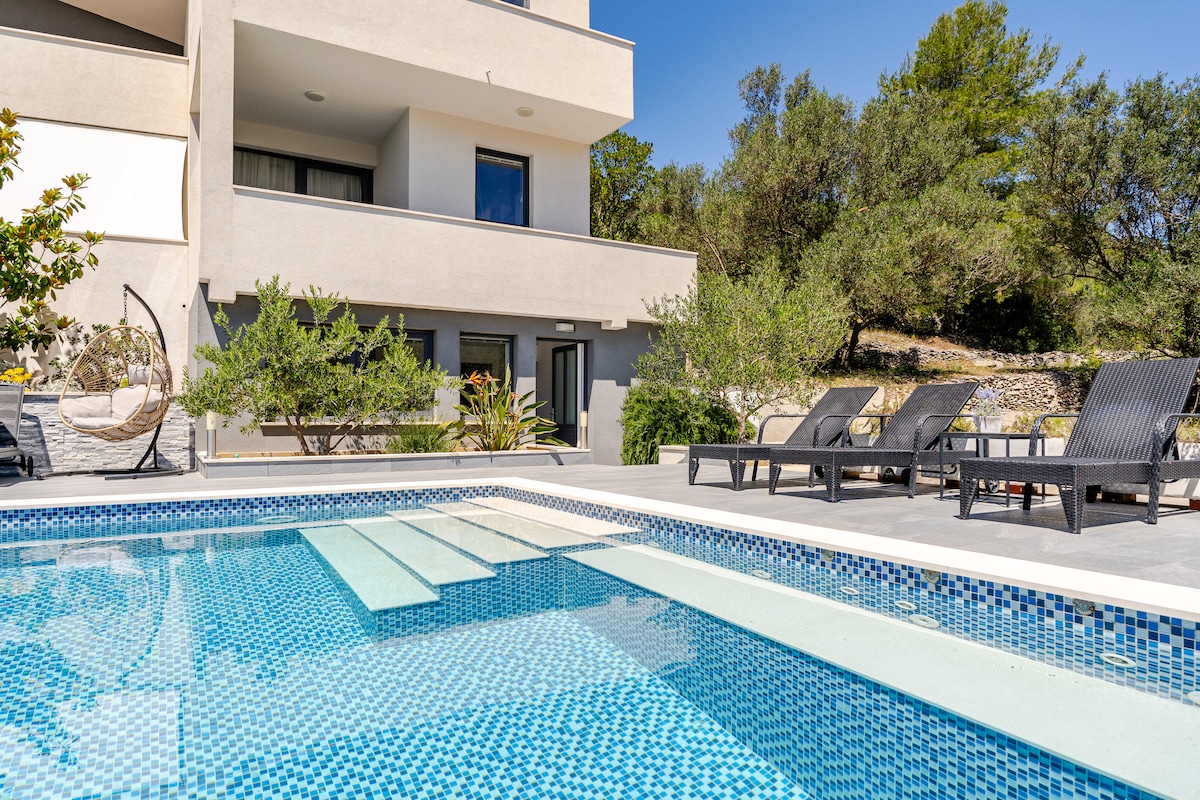 Novo in sodobno opremljeno stanovanje se nahaja na mirnem obrobju Vele Luke. Kuhinja , dnevna soba , 2 spalnici in kopalnica so popolnoma opremljeni . Stanovanje je sestavljeno iz bivalne terase s pogledom na Vela Luko . Idealno za sprostitev in uživanje v zgodnjih večernih urah. Stanovanje je klimatizirano z brezplačnim brezžičnim internetom in SAT. TV. Bazen deluje na elektrolizni sistem , sončno prho in ležalnike . Opremljena telovadnica s kopalnico v bližini bazena. Parkiranje je zagotovljeno ob vstopu v stanovanje.