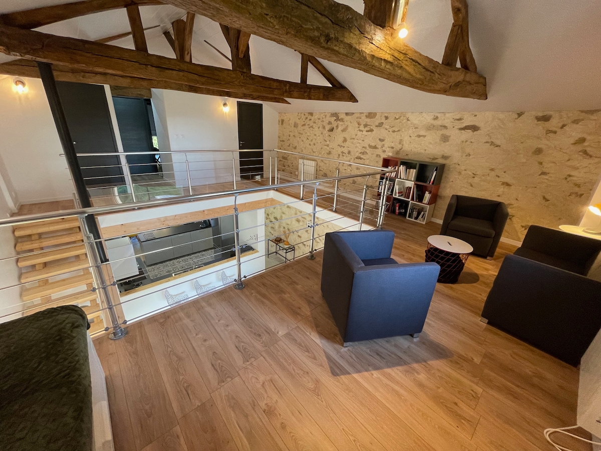 Respect du protocole de nettoyage renforcé établi par Air BnB Gîte de 130 m2 aménagé dans une ancienne grange réparti sur 2 niveaux. RdC : pièce de vie avec coin cuisine et coin salon. WC séparé. 1 chambre avec salle d 'eau privative (+ machine à laver). Etage : 1 chambre avec salle d'eau privative + couchage pour 2 enfants. WC séparé. Extérieur : cour anglaise de 93 m2 avec salon de jardin + barbecue + parasol + bains de soleil. Espace vert non cloturé accessible côté gîte et côté maison.