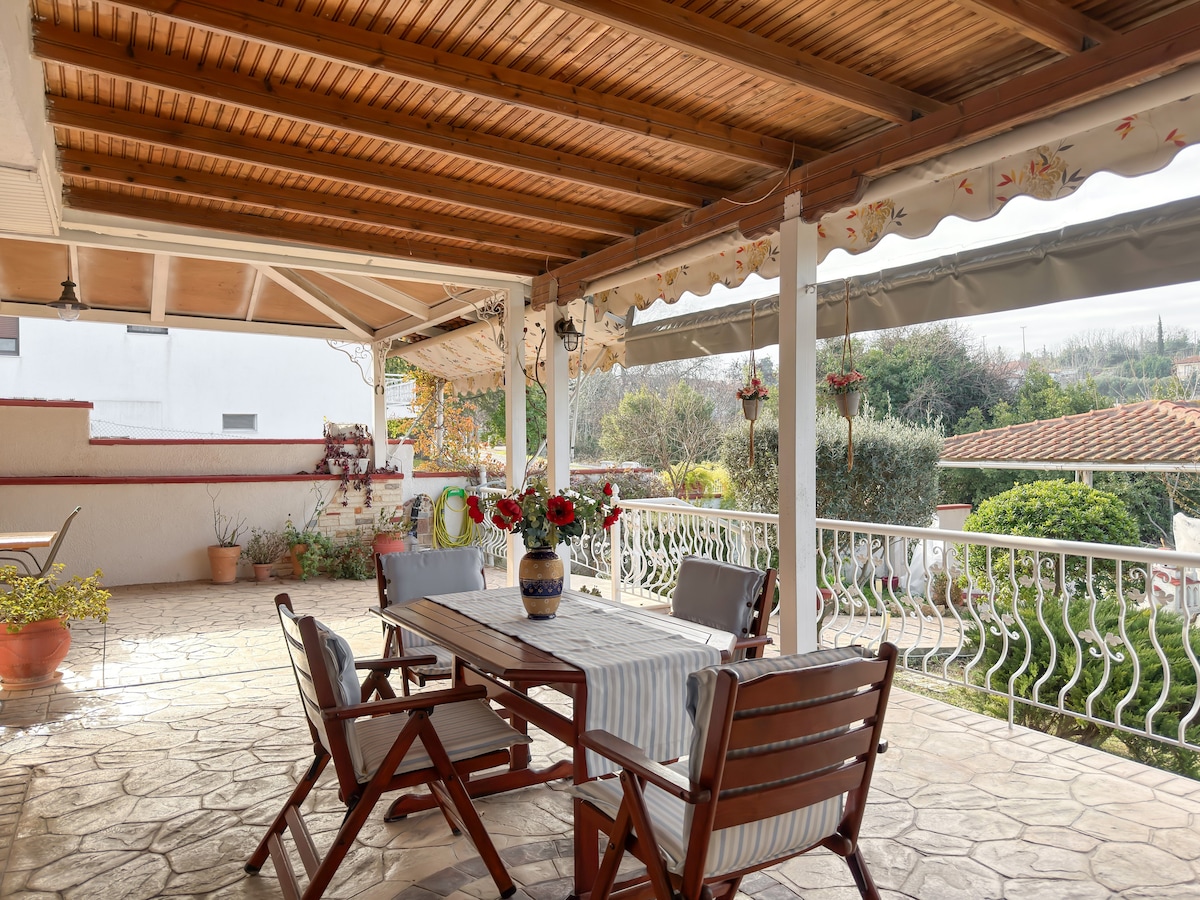 Naša tradicionalna in udobna hiša ima tri spalnice, dnevno sobo, kopalnico in WC. Velike terase s pogledom na zaliv Thermaikos, Katerini, Pierijo in Olimp. Nahaja se 100 metrov od trga, poleg mini trgovin, pekarne in gostiln. Hiša ima kamin z brezplačnim lesom, Wi-Fi in ZAPRTO parkirišče za 2 avtomobila. Bivajte z vso družino v tem čudovitem, popolnoma opremljenem prenočišču za edinstvene trenutke sprostitve in miru. Pripravljeni smo... ste vi?