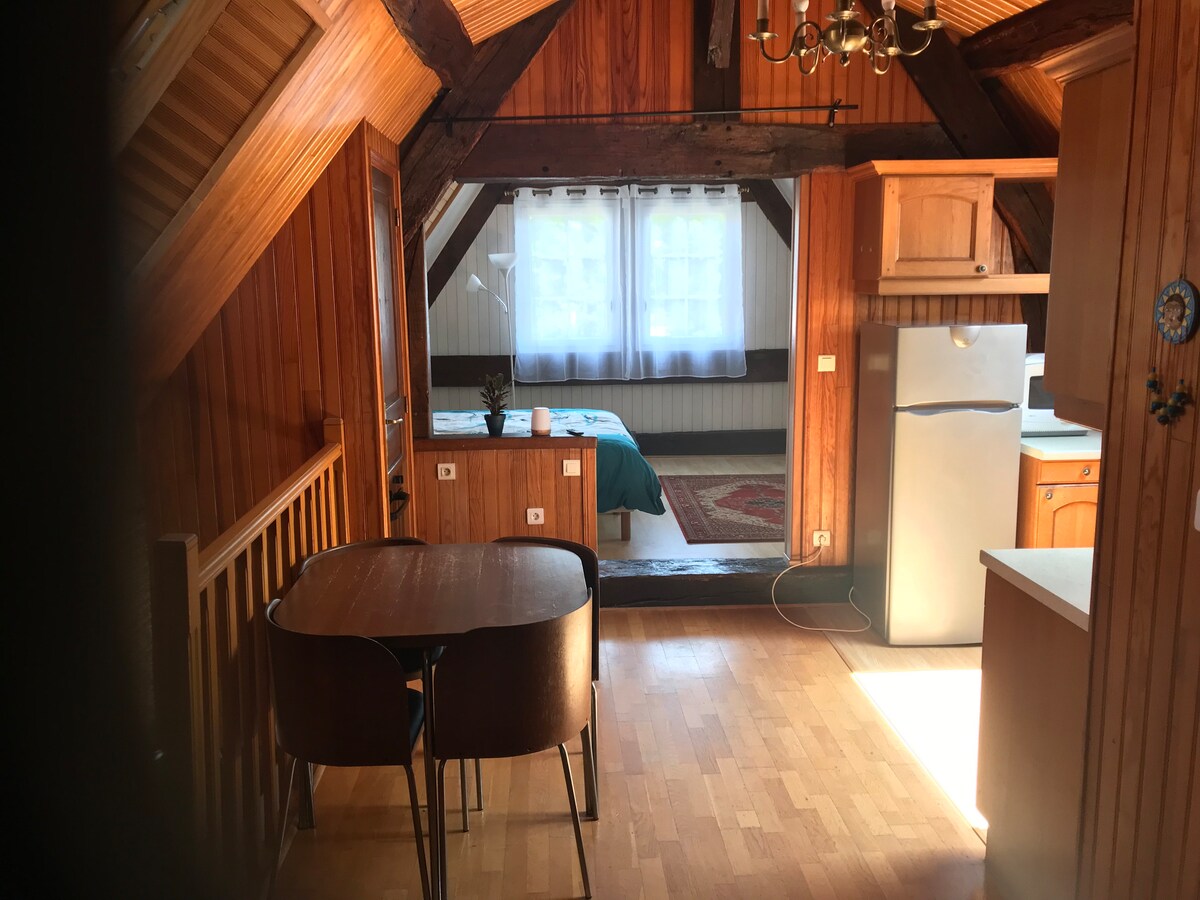 8 minut od zgodovinskega mesta Verneuil-sur-Avre, pridite in uživajte v miru normandijskega podeželja v tej majhni neodvisni hiši na kmetiji. Hiša se nahaja na robu reke in na robu gozda. Sestavljena je iz dnevne sobe z raztegljivim kavčem (širine 120 cm) in kuhinjske niše ter spalnice z zakonsko posteljo in kopalnico. Obiščete lahko pritlikave koze, ovce in piščance, ki živijo na kmetiji.