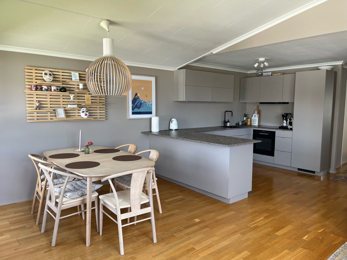 Modern and attractive house with 3 bedrooms. The house is located quietly, in the middle of a cul-de-sac with a fantastic view over the Larviksfjord, where sea and sky meet. This is recreation for the soul and a good place to be. Live with the sea right in front of you and the beautiful Bøkeskogen right behind. You have everything within reach; Bølgen cultural centre, Indre Havn, beach, Spa, town, restaurants, hiking, coastal path, training, transport. Everything within a 5-10 minute walk.