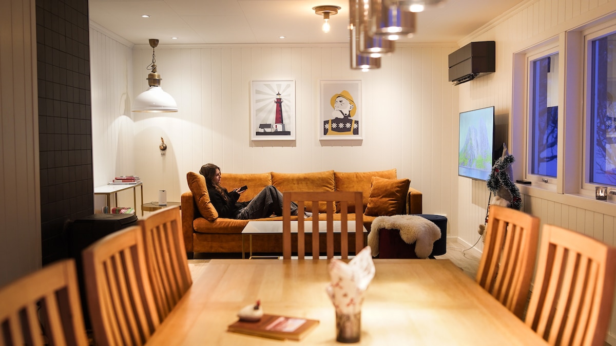 Sandersstua Stamsund is a family-friendly, cozy holiday apartment with a sauna, hot tub, and stunning fjord and mountain views. Fully renovated and modern, ideal for couples, families, and nature lovers. Fully equipped kitchen, cozy living room with fireplace and Smart TV, child-friendly. Rental car or motorboat available at extra cost. Perfect base for Lofoten adventures.