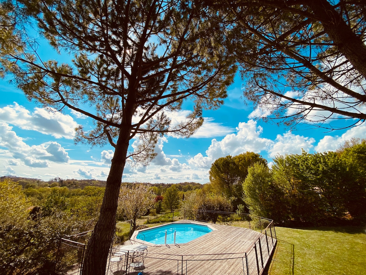 Welcome to our gorgeous country home nestled in rolling, forested hills. Enjoy an exceptional 180° view of the Dordogne while swimming in our infinity pool (open May to October only) or hot tub (available all year). Our property sits on 4 acres of tranquil countryside at the top of the verdant Dordogne valleys. Sit back, have a glass of wine, and watch the hot air balloons paint across the sky at sunrise or sunset. Use our bicycles to explore the locale or BBQ outside and take in the scenery.