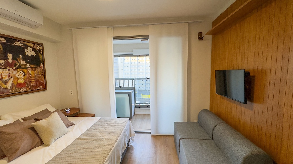 V trendovskem okrožju Vila Madalena, v zgornjem nadstropju popolnoma nove stavbe West Side Studios na ulici Harmonia. Balkon, Wi-Fi s hitrostjo 200 mb/s, pametna televizija, mini kuhinja z dupleks hladilnikom, kuhalna plošča 2 gorilnika, Nespresso. Zakonska postelja, ki se poleg spodnje strehe razteza v dve udobni ločeni postelji. Telovadnica, pralnica OMO, tržnica, Maleiro, Coworking. 150 m od podzemne postaje Vila Madalena. Lokalni objekti s trgovino OXXO, tržnica Pão de Açúcar Minuto. Plačljivo parkiranje pred stavbo.