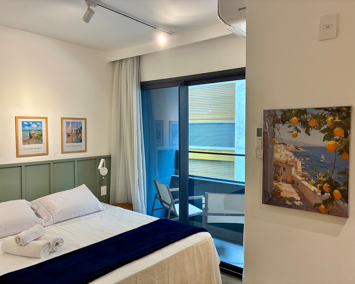 300 metrov podzemne železnice V. Madalena, blizu restavracij, trgovin, barov in kulturnih prostorov. Zelo udobna zakonska postelja, klimatska naprava, internet, SmarTV 42", velika delovna miza, jedilna miza, elegantna dekoracija, zložljiva okna z veliko naravne svetlobe in pogledom na mesto. Kitchen Compact ima mini hladilnik, električno kuhalno ploščo z dvema kuhalnima ploščama, vodni filter, aparat za sendviče ter mešalnik in posodo. Klimatiziran bazen, fitnes center, pralnica in mini-nadstropje.