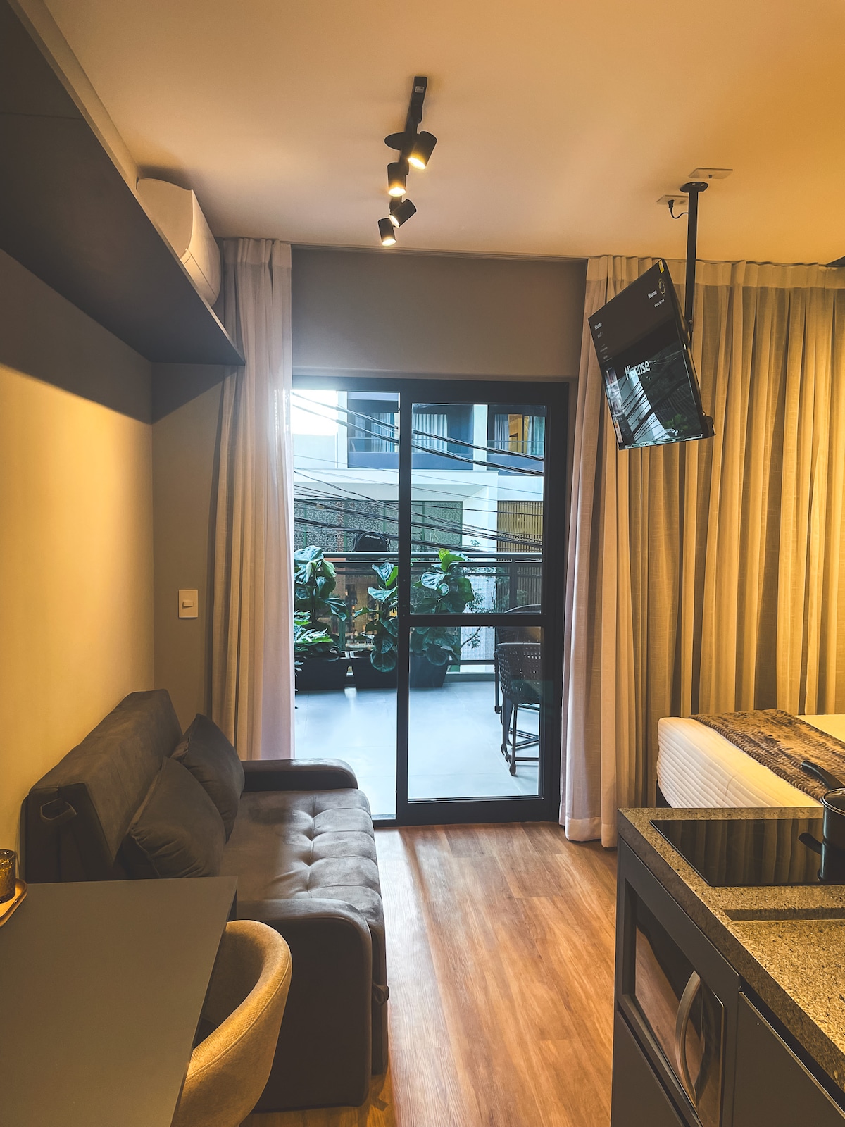 Studio se nahaja v 31. nadstropju najvišje stavbe v središču, s sodobno in gostoljubno zasnovo ter impresivnim razgledom na mesto. Skozi okno lahko občudujete dolino Anhangabaú, zgodovinsko središče, antene Av. Paulista: ena najlepših pokrajin v São Paulu. To je stavba, kjer se nahaja SampaSky in je mogoče hoditi do glavnih znamenitosti centra. Ima klimatsko napravo, 55-palčni televizor z aplikacijami, kuhinjo, opremljeno z osnovnimi pripomočki, kuhalno ploščo (1 usta), mikrovalovno pečico in minibar.