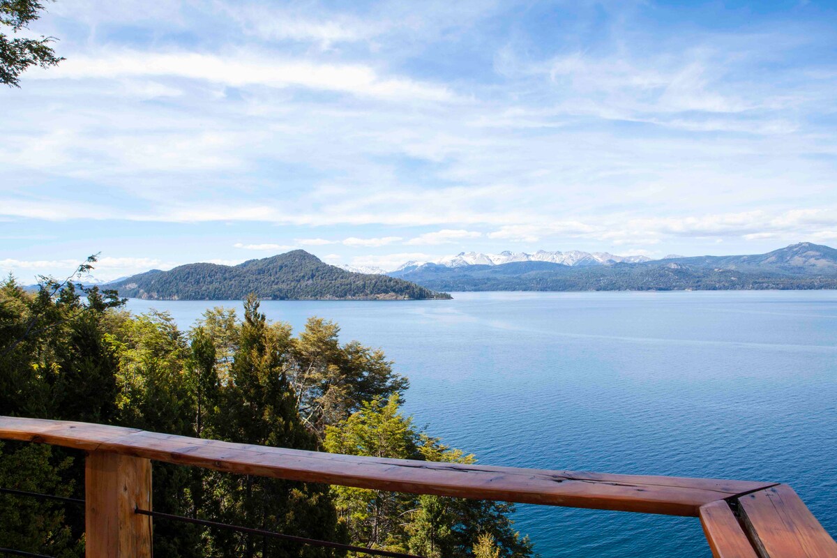Hiša v vili La Angostura s spektakularnim razgledom na jezero v soseski Bandurrias. Reka Correntoso je oddaljena 1,9 km hoje, reka Nahuel Huapi 2,1 km, reka Espejo Chico pa 5 km po stari cesti. Ima 3 spalnice, dve kopalnici in stranišče za goste. Odlično opremljena kuhinja. Wi-Fi in optični kabel. Pametni televizor. Električni generator. Žar in štedilnik. Ogrevanje s sevalno ploščo. Klimatska naprava in kamin na drva. Ogromna terasa s pogledom na jezero in zunanje pohištvo.