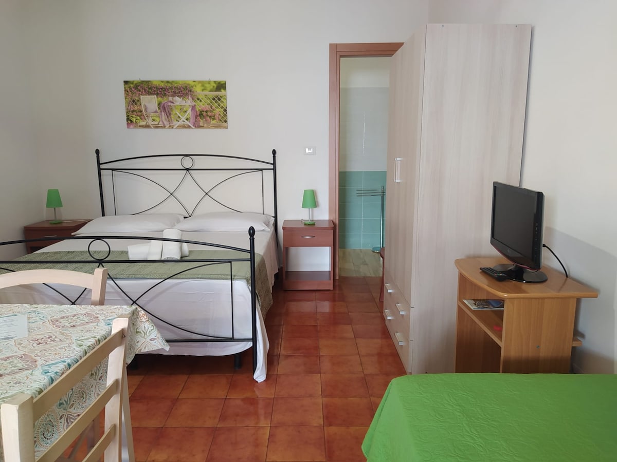 Stanovanje, obdano z zelenjem , z eno spalnico, dnevno sobo z opremljeno kuhinjsko nišo, kopalnico. Na zahtevo 1 ali 2 dodatni zunanji sobi s kopalnico.Zasebna terasa z mizo, žar. Skupni osvetljeni bazen 11 x 5 mt. Zasebno parkirišče Idealno za družine in skupine do 14 oseb. Hišni ljubljenčki so dobrodošli. Skupni prostori. Idealna lokacija za raziskovanje Lecceja in Salenta Super gostitelja Giuliana in Giuseppe vas bosta sprejela z nasmehom