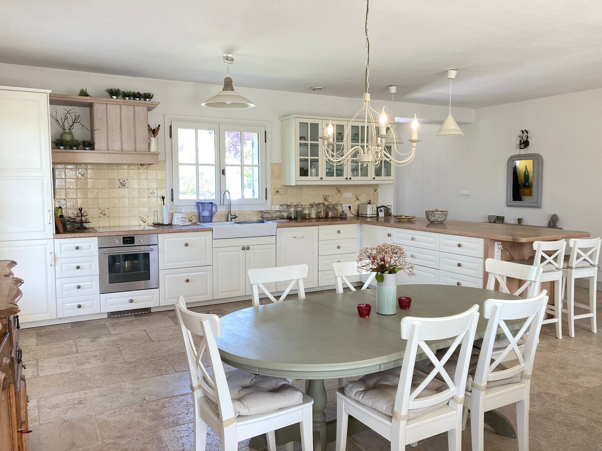 Cette villa de 300m2 peut accueillir jusqu'à 8 pers. Située à 5 min à pied du centre bourg, dans un parc protégé, elle offre 4 chambres et 3 salles de bain dont une chambre au rdch, une grande cuisine avec évier en pierre et ilôt central, une cuisinière traditionnelle, un immense frigo et une arrière cuisine. Le parc, une grande piscine (2,40 m de prof !!) chauffée sur demande, une cuisine d'été équipée et une terrasse couverte vous convaincront que le bonheur n'est pas si loin.