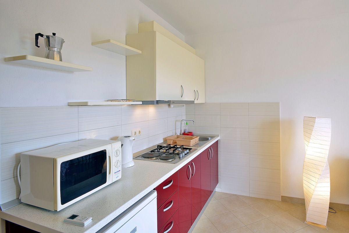 Stanovanje je v drugem nadstropju. Ima majhno kuhinjo, kopalnico in balkon na strani z delnim pogledom na morje in mesto. V apartmaju se nahaja dodatna enojna postelja.Prav tako je klimatiziran.