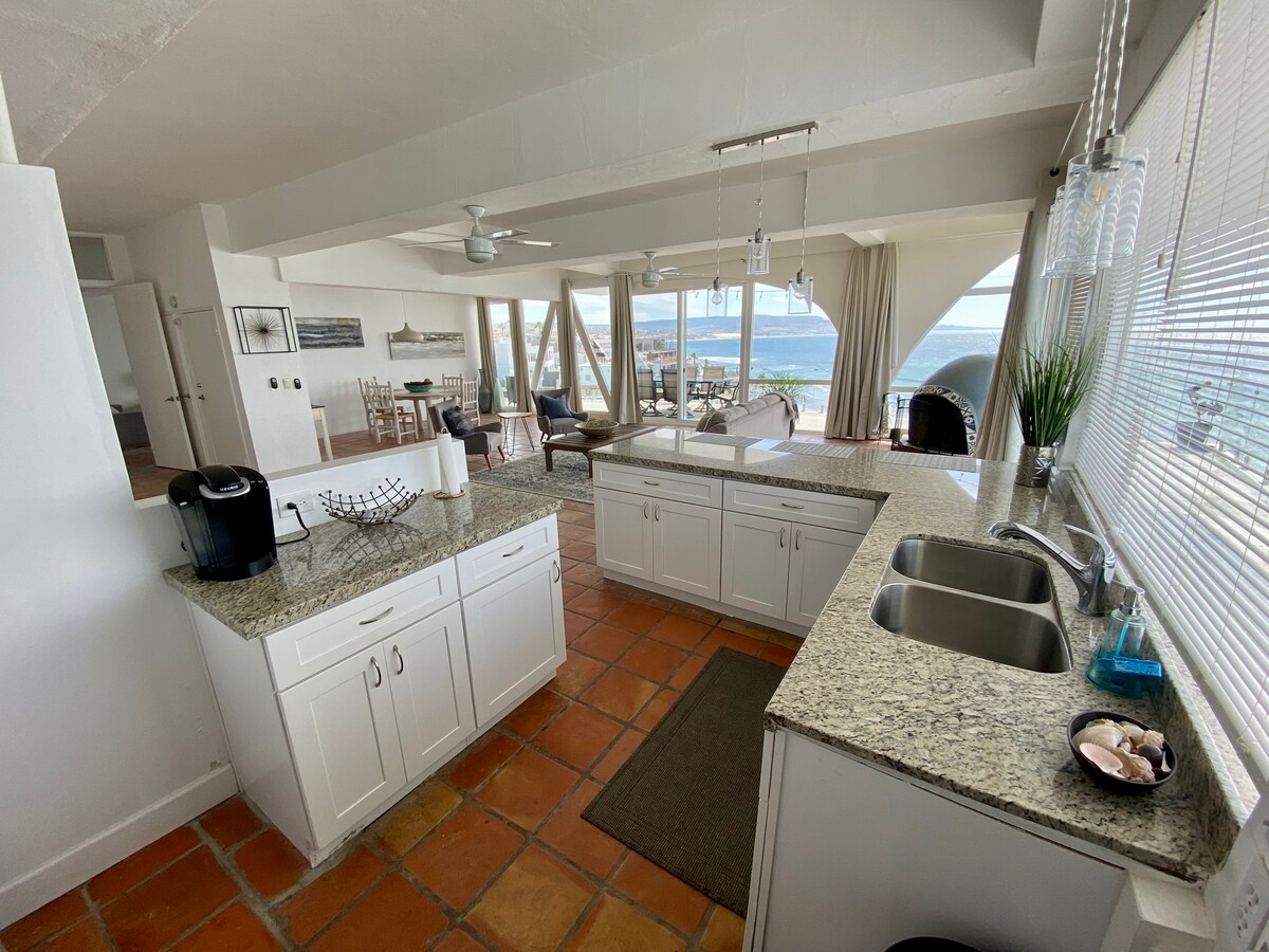 Neverjeten oddih je oddaljen le pol ure južno od meje v San Diegu. Mehiška rustikalna hiša v čudovitem Las Gaviotasu ima 180° neoviran pogled na ocean in belo vodo, izginjajočo steno za ogled terase, umetniško notranjost, obokane strope, tla s ploščicami Saltillo, lokalno umetnino in opremo. Uživajte v deskanju, pickleballu, odličnih bližnjih restavracijah in barih, bazenu in spa centru z blefom, zasebni peščeni plaži, zložljivih valovih, shuffleboardu, sprehodu po tlakovanih ulicah in sprehodih ali pa se preprosto preprosto sprostite!