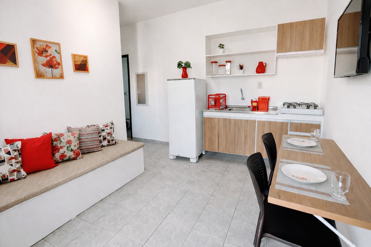 Nova in sodobna garsonjera ponuja udobje in varnost. Ima 1 zakonsko posteljo (Queen), 1 raztegljiv kavč, klimatsko napravo, pametno televizijo, Wi-Fi, kuhinjo z mini barom, mikrovalovno pečico, grelnikom vode, posodo in drugimi pripomočki za hitre obroke. Nahaja se v središču Vitória da Conquista in ima garažo, elektronsko ključavnico za samodejni prihod/odhod. Stavba ima kamere, digitalno ključavnico. Počitek v tem elegantnem, elegantnem in varnem okolju. Elegantno doživetje v tem dobro lociranem bivališču in ponuja elegantno doživetje.
