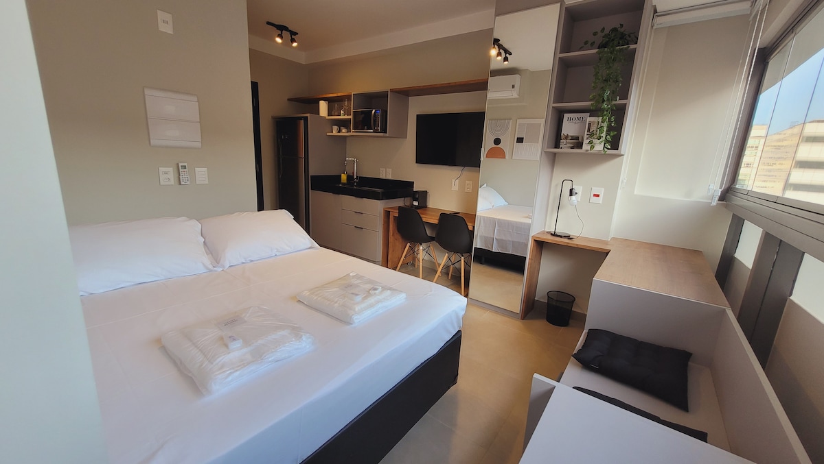Nov in sodoben studio z osnovno opremo in pripomočki za vsakdanje življenje. Vrata balkona za HRUP so brezskrbna. WI-FI Vivo Fibra 300 mega, NETFLIX, Amazon, Globoplay. Nahaja se na ulici Oscar Freire, Jardins, ob ustju PODZEMNE ŽELEZNICE Oscar Freire - rumena črta4, v bližini Av. Paulista, Augusta Street, supermarketi, restavracije, znane trgovine, lekarna, bolnišnica das Clínicas. Nova stavba s 24-urnim hišnim upraviteljem, 25-metrskim bazenom, polnim fitnesom, stojalom za kolesa, coworkingom.