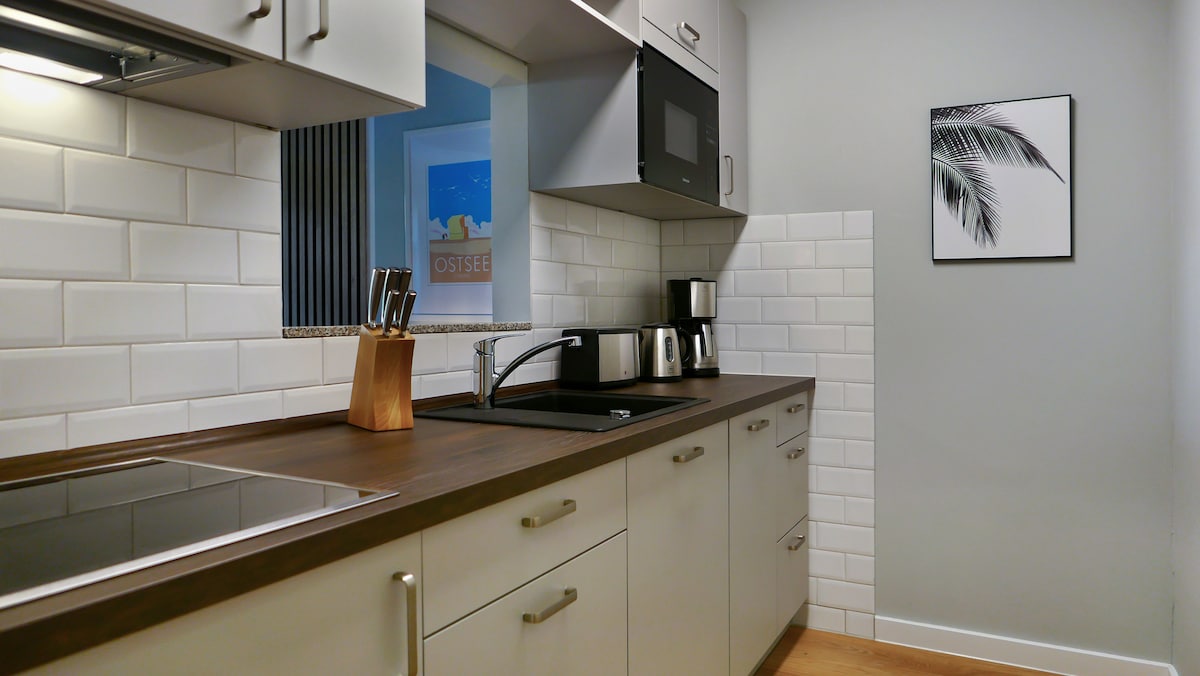 Objavljena hiša. Zgodovinsko zidanje se sreča s sodobno interpretacijo. Prostorno in zelo visokokakovostno stanovanje na mirni lokaciji sredi starega mestnega jedra, z izvirno opečno steno iz srednjega veka, udobnim kaminom in popolnoma opremljeno kuhinjo. Le nekaj minut hoje do pristanišča in Ozeaneuma ter nakupovanja. Vključno s parkirnim mestom tik ob hiši, Wi-Fi-jem, pralnico. Kopalnica iz naravnega kamna z deževno prho in popolnoma stekleno prho. Visokokakovostni raztegljiv kavč v dnevni sobi.