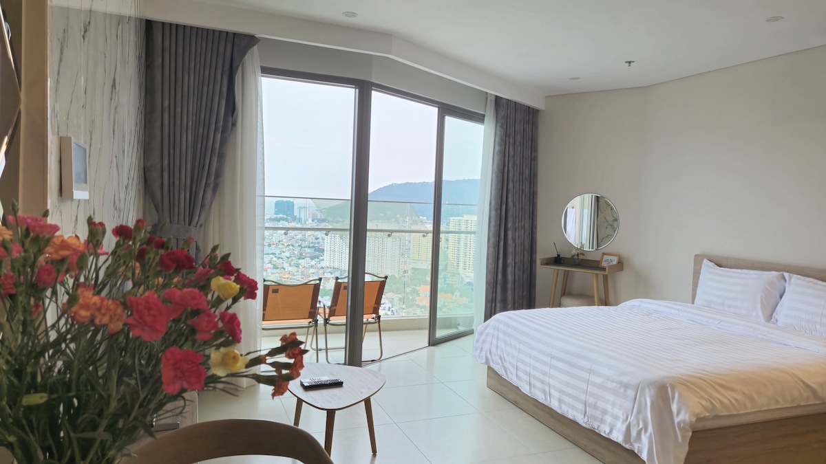 Naš apartma ima 1 dnevno sobo, jedilnico, 1 spalnico (1 zakonska postelja in kavč), 1 kopalnico in balkon. - Spalnica: Naš razgled iz spalnice je romantičen s pogledom na Grand Hill shimmering. Nudimo klimatsko napravo, nadvložek za posteljo in podstavek. - Kuhinja: na voljo so potrebni prostori za pripravo okusnega obroka. - Balkon: prostoren balkon s kompletom 2 trsnih stolov v primerjavi z 1 mizo, kjer se gostje sprostijo in uživajo v osupljivem pogledu na modro morje z okusnim obrokom.