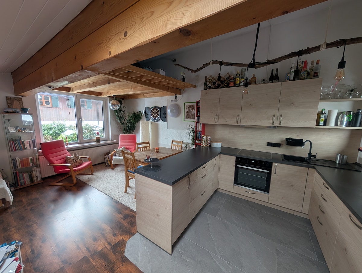 ✨ Auszeit im Grünen Stilvolle, helle Dachwohnung mit eigener kleiner Loggia – ideal für Paare (und kleine Familien) , die Ruhe und Komfort lieben. 🌿 Wohnen & Wohlfühlen ✮ Kleine Loggia mit Wiesenblick für Frühstück + Sundowner. ✮ Wohnraum mit Sofa, Esstisch, Klimagerät, Küchenzeile (Ceran, Mikrowelle mit Grill/Heißluft, Kühlschrank mit Gefrierfach, Carbonator, Nespresso etc.). ✮ Schlafzimmer mit Doppelbett, Einbauschrank und Sekretär. ✮ Bad mit Wanne, Duschwand, WC und großem Spiegel.