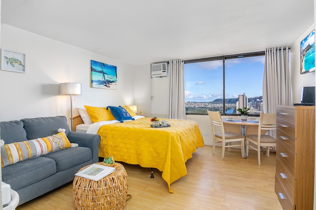 Na začetku Waikikija, turističnega središča Honoluluja. Naša očarljiva garsonjera v Waikikiju je vetrovna enota v stavbi havajskega monarha Uživajte v osupljivem gorskem razgledu. Na vas čakajo kakovostne hotelske rjuhe, blazine in klimatska naprava. Odlična lokacija nasuprot konferenčnega centra, približno 10 minut hoje do plaže in 15 minut hoje do nakupovalnega središča Ala Moana. Večerjajte, plavajte, deskajte in kupujte - vse je v bližini peš.