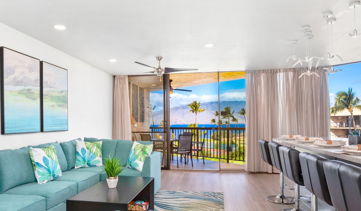 This elegant retreat has been completely remodeled, it’s not just a place to stay, it will become a part of your stay. Before even opening the door you're greeted with a pineapple carved into the entry way stone, a symbol of welcome and hospitality. Mountain and partial water views from the private lanai, see the sky change colors at home while the sun sets or watch from the beach right across the street.