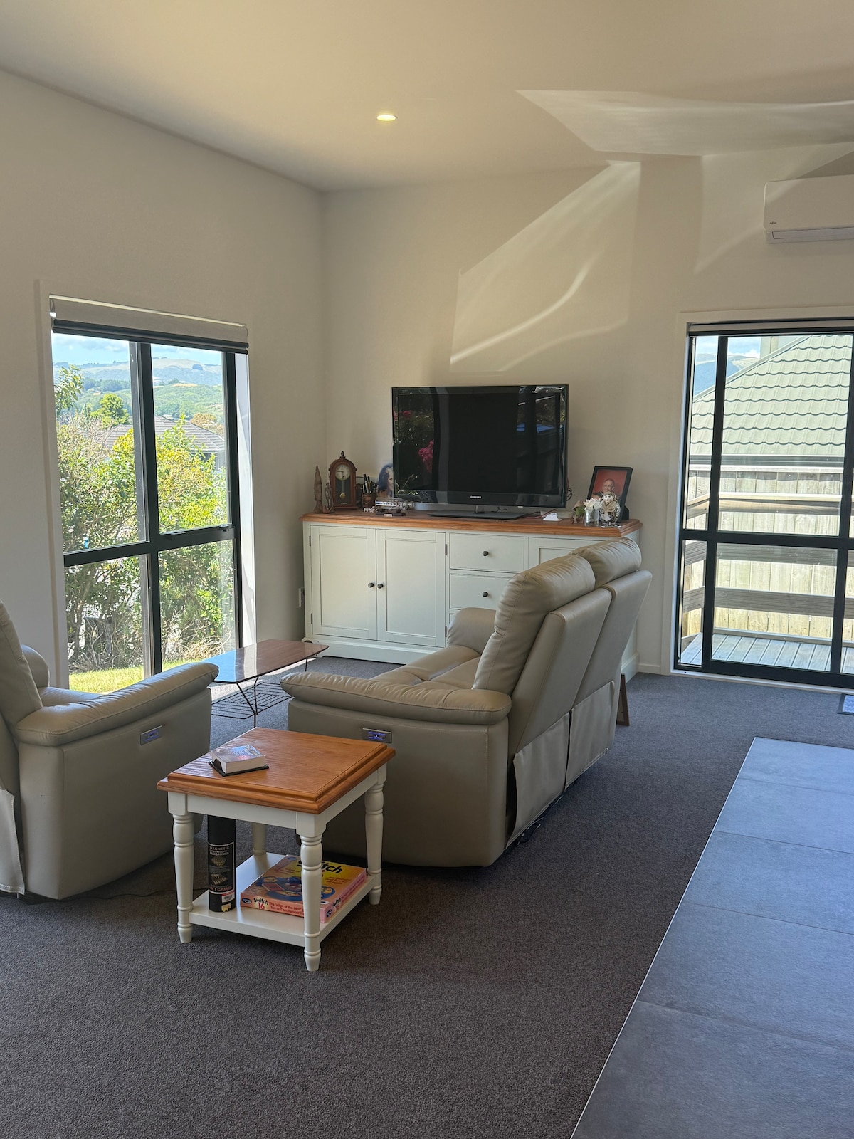 Our sunny, comfortable, two-storey house is ideal for a couple or a couple with small children. The master bedroom/ living area upstairs is spacious with beautiful views of Kapiti Island. The stairs are a little awkward for the elderly and the very young although we now have carpet tiles on the stairs. There is no handrail. There is no bathroom upstairs. Sitting/ kitchen area downstairs and the bathroom and second bedroom are also downstairs.
