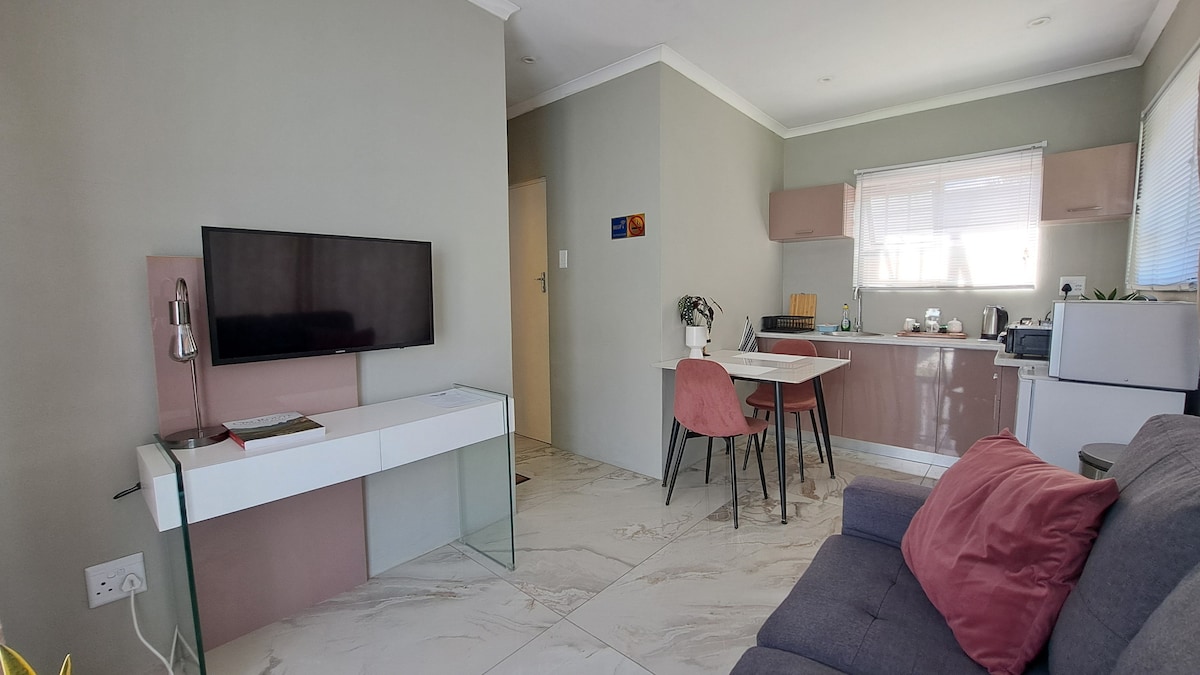 Čudovit apartma za goste, ki se nahaja v mirnem, listnatem predmestju Walmerja. 5 minut od letališča s številnimi lokalnimi restavracijami v hoje in nakupovalnim centrom v bližini. Wi-Fi in televizija z Netflixom, DSTV, Showmax in Disney+. Sončna elektrika med bivanjem pomeni, da med bivanjem ne smete prenašati tovora. Zasebni vhod in dvorišče, varno parkiranje pod krinko izven ulice z električno ograjo. Na voljo so objekti Braai.
