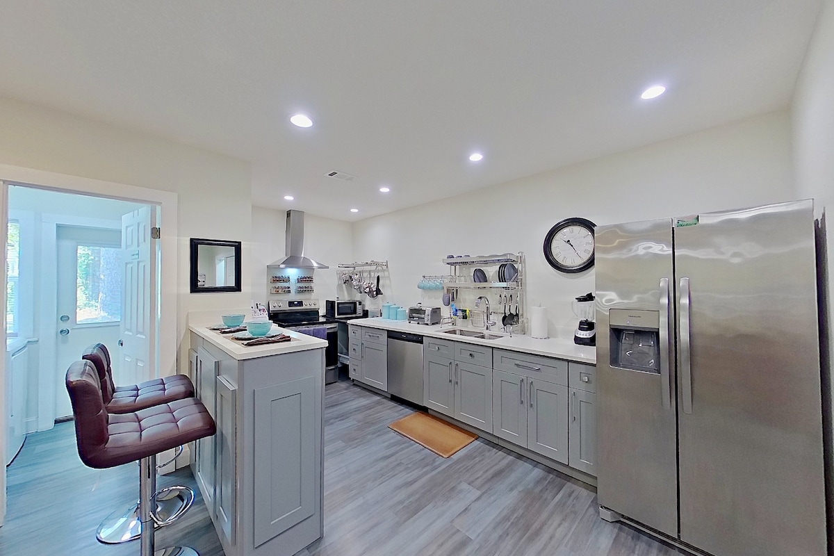 Work & relax in this stylish private 1BR with a heated massage chair, standing desk, and spa-style shower—perfect for remote work and extended stays. Enjoy a spa-like shower with body sprays and plush robes, a makeup vanity with lights. Includes a full kitchen with over 20 seasonings, smart TV, shared laundry, and easy self check-in. Walk to a nearby park with tennis and pickleball. Quiet, comfortable stay with all utilities included. Ideal for traveling professionals, nurses, and couples.