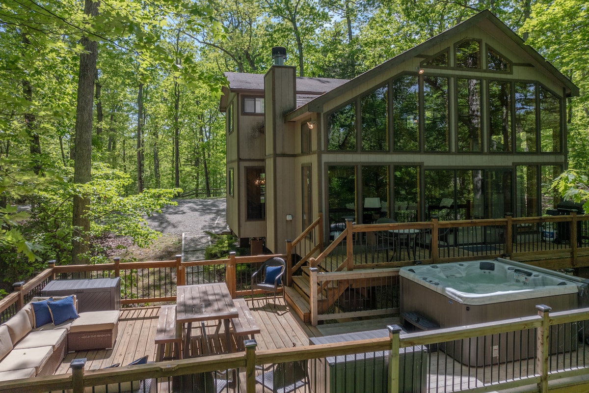 Spring's in bloom at your own private, cozy chalet. Seasonal discounts still apply! Tucked in the trees, this pampered, private A-frame chalet overlooks Sonnenblick Lake through the trees and includes its own secluded dock just down the path. Relax on the spacious deck, gather by the fire pit, or soak in the brand-new hot tub under the stars. Inside awaits a spotless, thoughtfully designed retreat with cozy beds, a chef’s kitchen, fiber Wi-Fi, and serene forest views.