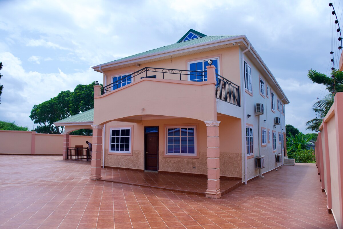 Uživajte v Akri v svojem zasebnem domu! Ta 4-sobna hiša ponuja popolno udobje s kopalnicami v vsaki sobi. Delite zgodbe s potovanj in ostanite povezani z brezplačnim Wi-Fi-jem. Sprostite se ob televizorju. Počutite se varno s sodobnimi varnostnimi funkcijami, kot so nadzorne kamere in električne ograje. Ohladite se s klimatsko napravo po vsej hiši. Pripravite svoje najljubše obroke v kuhinji in brezplačno parkirajte avto v sklopu namestitve. To je vaš popoln oddih v Akri – rezervirajte zdaj in začnite svojo gansko pustolovščino!
