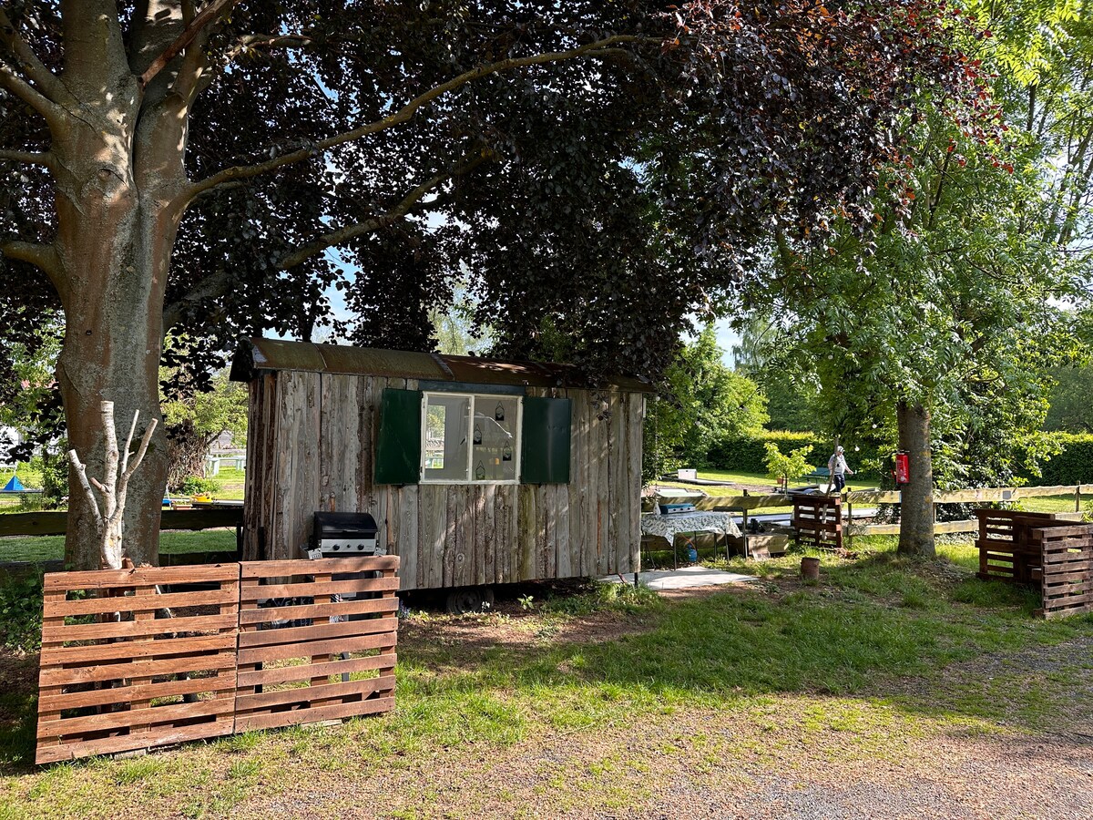 Lesena hiša 13 m2 sredi našega velikega sadovnjaka z mini kuhinjo, štedilnikom na drva, plišastim straniščem in sončno energijo. Obstajata 2 postelji, ki ju lahko postavite kot zakonsko posteljo ali enojno posteljo. Naj bo preprosto, brez televizije in Wi-Fija, ampak veliko MIRU in NARAVE. Na voljo je vrt s sončno gugalnico, kaminom in tipijem (poleti). Hiša je 30 m stran in na voljo je prha, ki jo lahko uporabljate od 7.30 do 22.00 in kjer lahko odložite umazano posodo.
