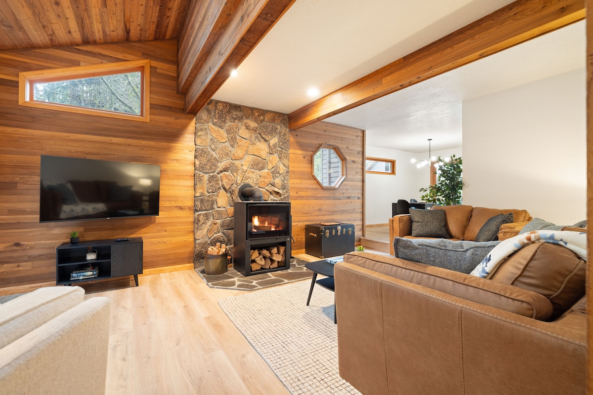 Sprostite se z družino v tem mirnem prenočišču na reki Sandy. To prenočišče po meri se ponaša s čudovitimi detajli iz cedro na Aljaski, obokanimi stropi in udobnim plinskim kaminom v čudoviti sobi, polni svetlobe. Sprostite se v masažni kadi ob poslušanju reke ali pa se sprehodite po rečni poti. Blizu pohodništva, kolesarjenja, snežnih športov, restavracij in živil. Gostje imajo tudi sezonski dostop do opreme skupnosti, vključno z bazenom in športnimi igrišči. To je popoln oddih za ustvarjanje trajnih spominov.