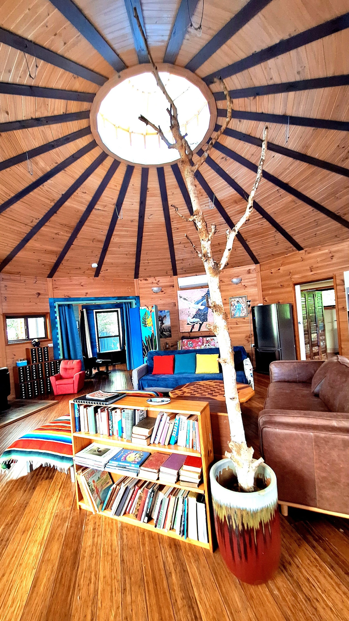 This unique yurt shaped 8.4 metre diameter wooden self contained cottage is your original Airbnb philosophy and prices. We live in the two other buildings and love to share this unusual accommodation with guests. It's a 5 - 10 minutes walk into the shopping area and cafes.