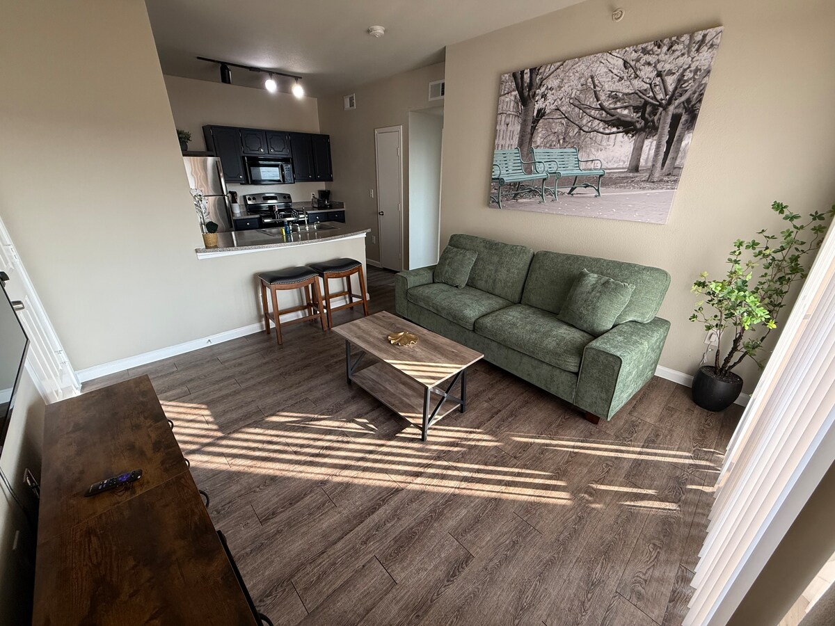 Enjoy a stylish experience at this stylish, centrally-located, beautiful Apt home with patio! This stunning home offers a blend of luxury and convenience, featuring: *Spacious Living Room *Open Floor Plan *Google Fiber Internet/WiFi *65" Smart TV *Spacious Kitchen *Stainless Steel Appliances *Large Comfy Queen Size Bed *HUGE Walk-In Closet *Washer & Dryer Inside Apartment *24/7 Fitness Center On Site *Resort-Style Pool And so much more! Perfect blend of luxury, comfort, and convenience!