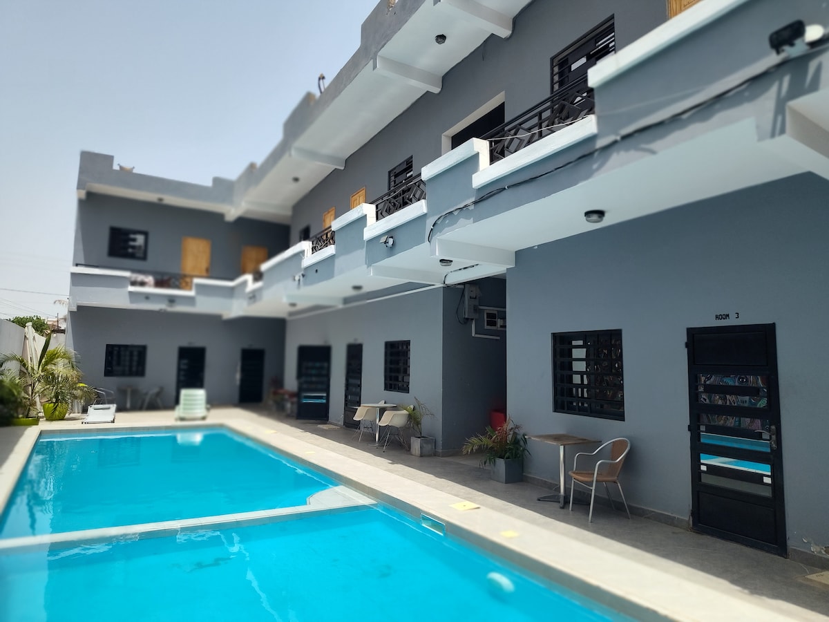 Doživite udobje in priročnost v naši hiši za goste, ki se nahaja le 5 minut hoje od osupljive plaže Fajara. Prostorna klimatizirana soba z zakonsko posteljo in kopalnico. Naša glavna lokacija zagotavlja enostaven dostop do lokalne opreme: 3 minute hoje do islandske restavracije za najboljše puščave. 4 minute hoje do glavnih bank, kot so Standard Chartered, Zenith Bank in GT Bank. 8 minut vožnje do živahnega območja Senegambije, polnega restavracij, trgovin, nočnega življenja itd.