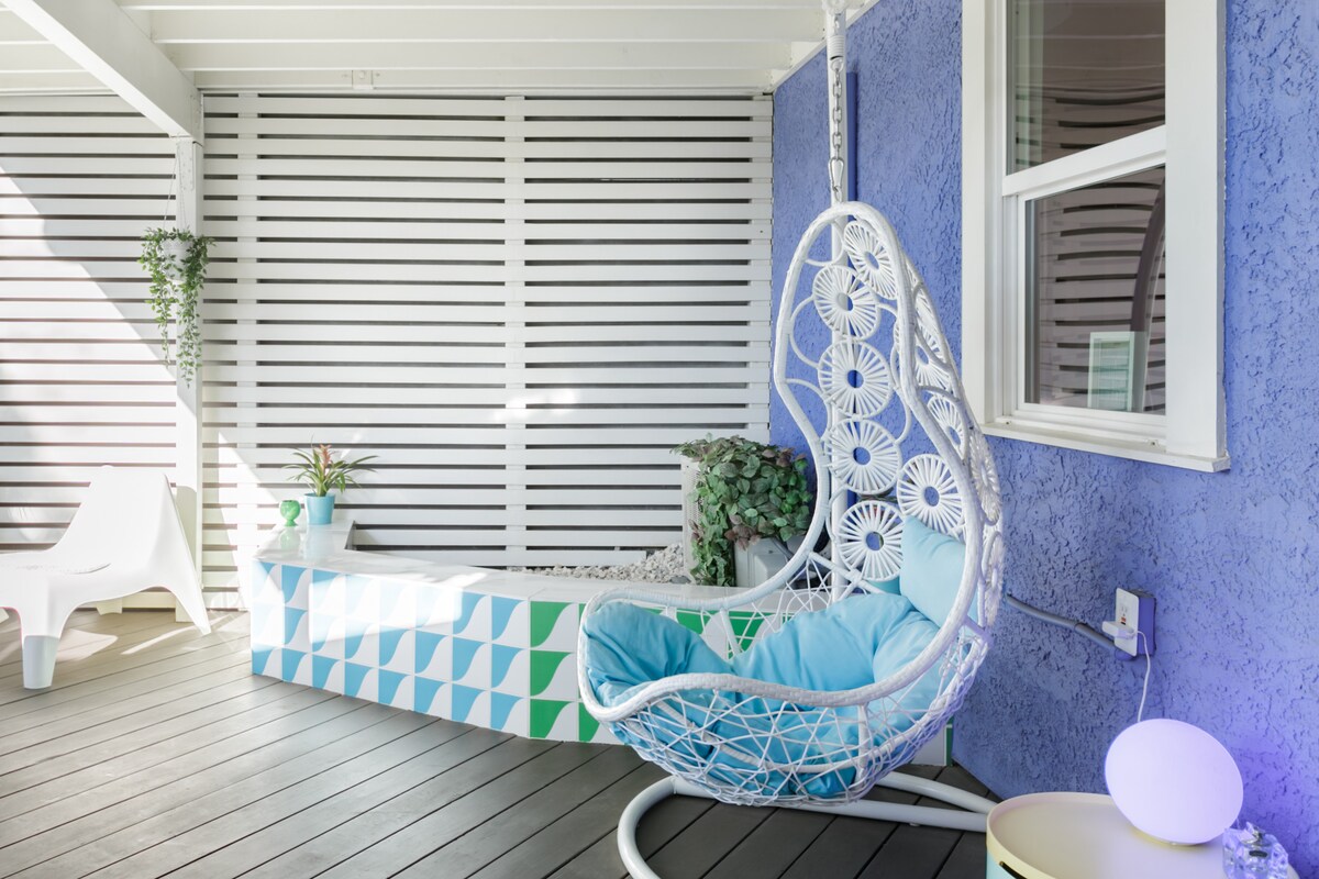 The home's decor is inspired by '60s pop culture and carefully curated to deliver a unique, mod, vibrant and fun experience. Look for the many thoughtful colorful details that have gone into every inch of the space. Also enjoy the stunning LA sunset from the shaded balcony that is overlooking a beautiful park. The neighborhood is safe, cute and everything is just down the street. New restaurants are popping up constantly, so great cuisine is everywhere!