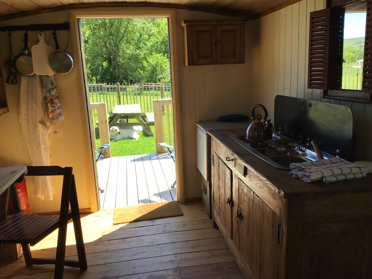 The Vintage retreat is set in its own field with stunning views, birdsong, clear skies and no light pollution for perfect star gazing. It has its own external, private shower and toilet situated just to the side of the wagon. It has both inside (gas hob) and outside cooking facilities with a fire-pit, and BBQ . There are numerous walks (many of which are included in the manual) and dogs are welcome. There are electric sockets, lighting and a fridge.