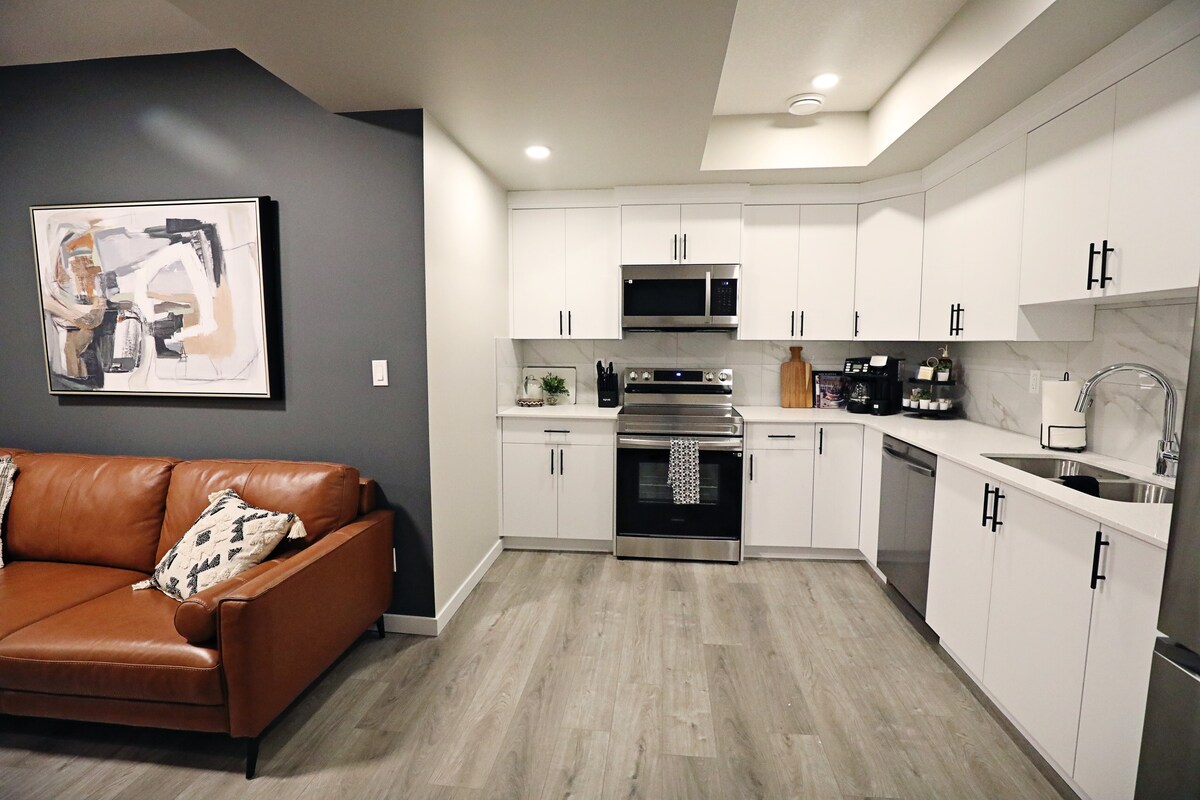 Apartma za goste z zasebnim vhodom | 2 veliki spalnici | Kuhinja | Pralnica | Za 4 osebe Sprostite se, osvežite in obnovite. Ta dobro osvetljena in prostorna kletna suita ima dve spalnici z zakonsko posteljo (Queen) in zakonsko posteljo, talno sevalno ogrevanje in ambientalni kamin. Pametna televizija z vrhunsko kabelsko televizijo in omrežjem Wi-Fi. Popolnoma opremljena kuhinja polne velikosti s potrebščinami. Vhodna prha. Kopalni pralni/sušilni stroj. Ta suita ponuja vse, kar potrebujete za kratkotrajno ali dolgotrajno bivanje. Povprašajte nas o mesečnem popustu.