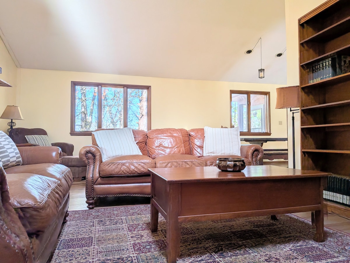 To čudovito hišo iz sredine stoletja je zasnoval in zgradil moj oče. Starša mojega moža, Amy in Bob, sta ga kupila na posestvu mojih staršev in ga obnovila. Je polna svetlobe, knjig in izvirnih umetnin. V prenočišču se počutite kot zunaj. Opremljeno je tako, kot je bilo, ko so se moji sorodniki izselili, s številnimi Amynimi slikami. To ni nova ali elegantna hiša, je pa avtentična in precej čudovit primer arhitekture iz sredine stoletja! Upam, da vam je všeč prav tako kot meni.