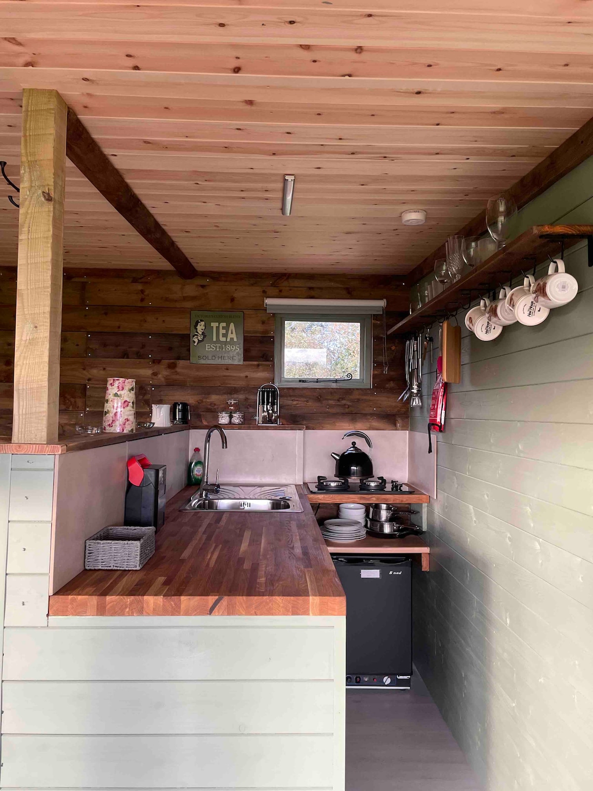 The Yurt offers Glamping on another level.Timber framed with decked outside area there is everything you could wish for,fully equipped with smart TV, woodburner, double bed & sofa, custompoke kitchen with toaster,kettle,microwave, retro frižider ,2 ring hob & full Belfast sink. Kopalnica ima stranišče, prho in umivalnik, zunaj pa je dodana dodatna terasa, ki je kot nalašč za obedovanje na prostem in uživanje v masažni kadi!