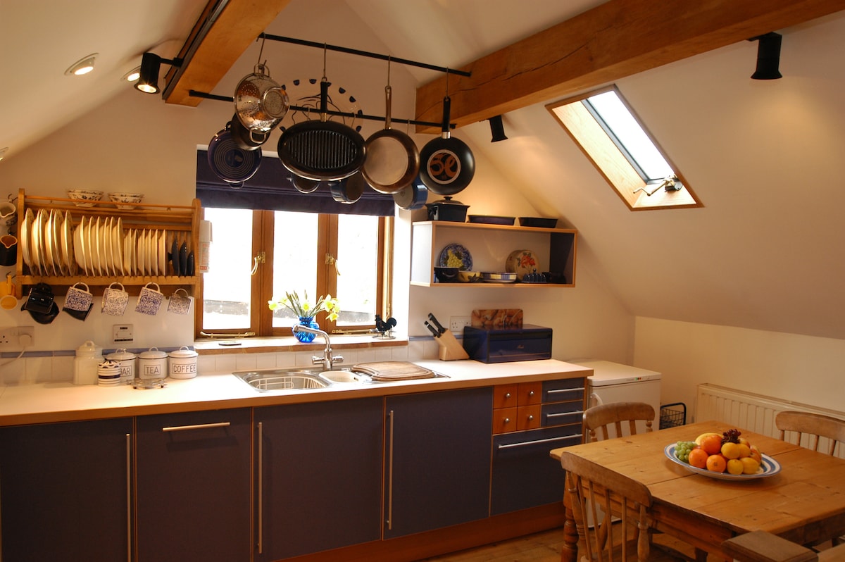Our charming rural retreat has flexible accommodation for 6/7 adults PLUS small children. Modern kitchen & bathroom. Private staircases lead to Bedroom 1 - double bed + single Zedbed on request. Bedroom 2 - twin beds. En-suite WCs to both. The Garden Room is EITHER Bedroom 3 (with kingsize bed OR 2 singles) OR an additional sitting room. Travel Cot available. Sitting Room has a log burner for WINTER evenings. Secure, private, sunny rear garden with lawn and patios.
