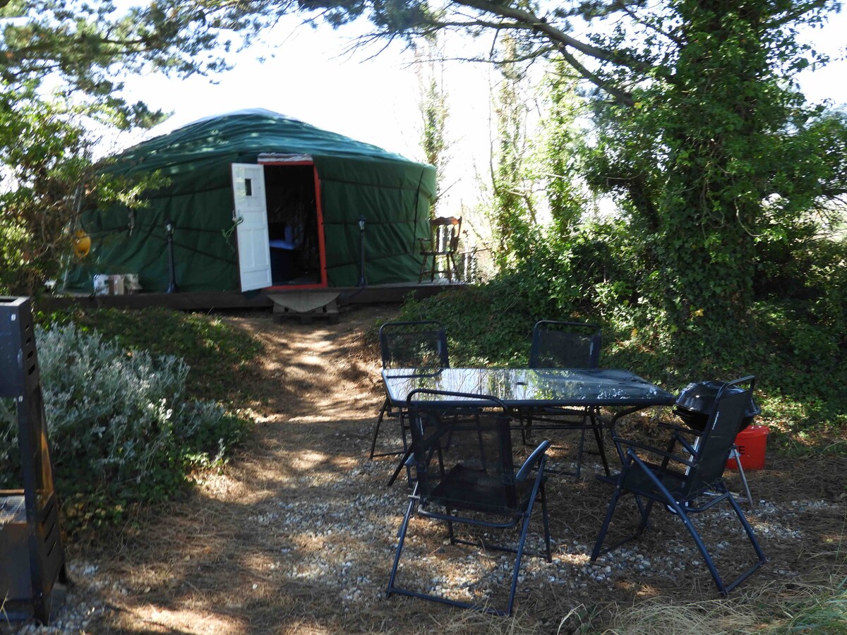 A beautiful yurt in an idyllic setting, our Bluebell. Relax and unwind in a hidden gem. The ground blanketed with Bluebells throughout April and some of May. Comfortably sleeps 4 with a lovely double bed and pull out two futons. There is a shelter with seating, lighting, bbq and drinking water. There is also a rustic firepit. There is a shared kitchen and toilet/shower block up at the farm for guests to use. Bedding is provided but please bring your own towels. Relaxation is gaurenteed