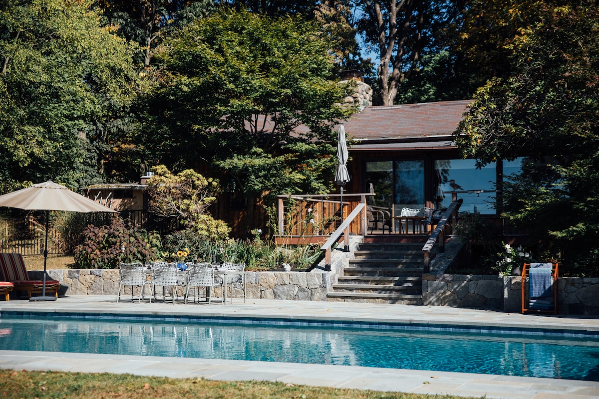 Ta zgodovinska hiška ob reki, v kateri je nekoč bivala igralka Misty Rowe (Hee Haw, Brady Bunch, Love Boat), združuje rustikalno eleganco in sodobno udobje. Sprostite se ob kamnitem kaminu, kuhajte v popolnoma opremljeni kuhinji ali pa stopite na teraso s pogledom na reko in uživajte v mirnem razgledu. Zunaj se sprostite v ogrevanem bazenu ali masažni kadi, ki je na voljo vse leto, družite se v paviljonu ali pa opazujte divje živali ob reki. Uporabite kurišča in še marsikaj drugega. Mirno zatočišče, ki je od središča Greenwicha oddaljeno le 5 minut, od New Yorka pa 35 minut.