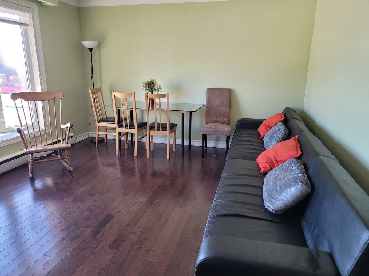 Legal Basement - This chic place comfortably accommodates up to 5 guests and comes fully furnished. There are 2 bedrooms, each accommodating 2 guests, along with a daybed in the living room for the 5th person. One bedroom offers a queen-size bed, while the other has a double-size bed. Also, there are 2 study tables with chairs, one in each bedroom and one in the living room. The meticulously designed kitchen boasts modern and luxurious touches. The stylish washroom features a standing shower.