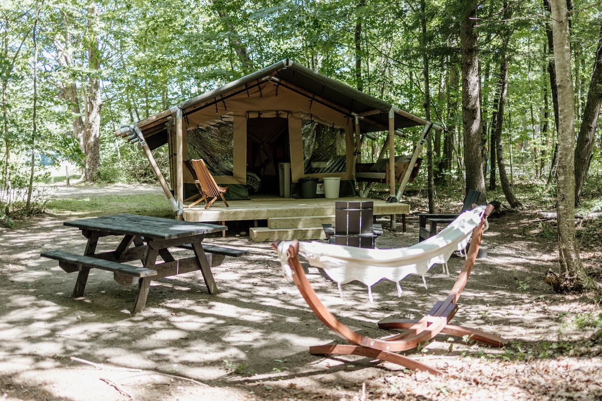 Enjoy the lovely setting of this romantic spot in nature. Sugar Brook Glamping provides the excitement of outdoor camping with the comforts to add absolute perfection to your camping experience. This oversized platform with canvas tent includes a private grill, your own fire pit and best of all you are a 3 minute walk to Basecamp common lounge to enjoy all the amenities such as 2 fully equipped bathrooms with walk in showers. We provide towels, body wash. Full kitchen, WIFI and more!!