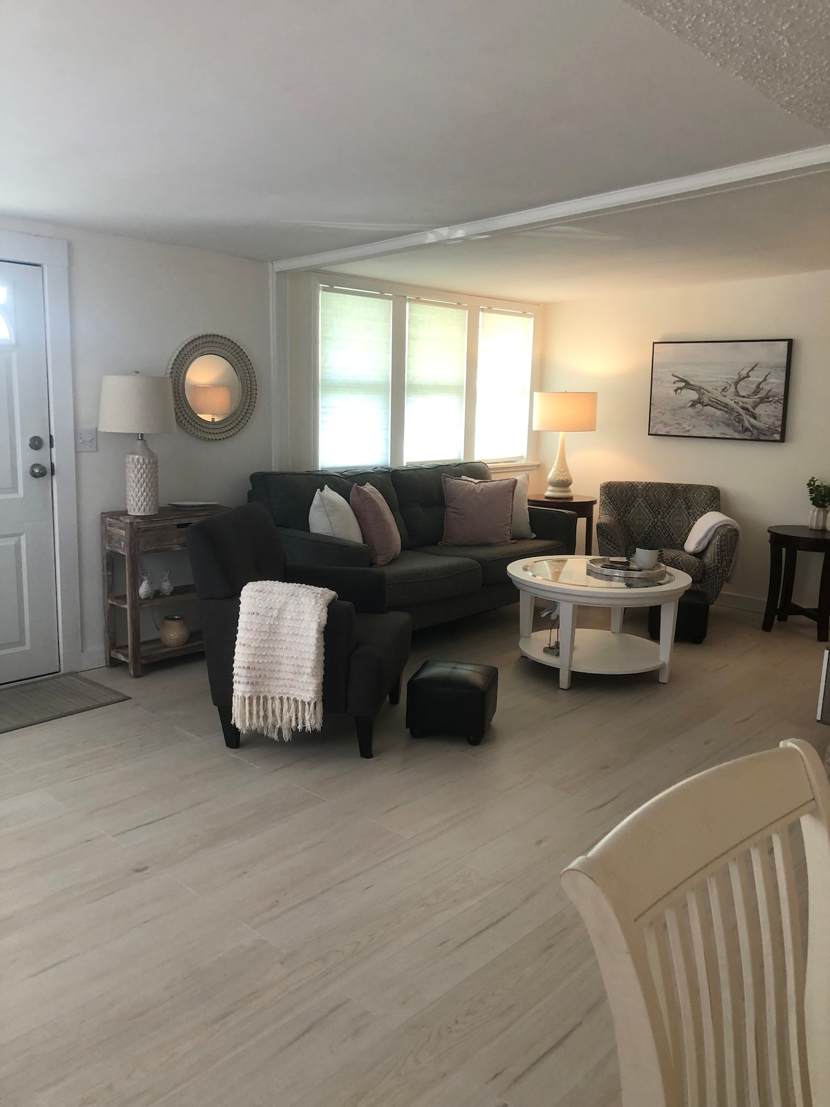 Newly renovated (November 2025) modern first floor condo literally five steps away from the sand walking outside from the lanai. One bedroom /One bath King bed in Primary Queen sleeper sofa in living room Key code entrance Free parking Heated Swimming pool on site Free Beach loungers on the beach Paid laundry machines on site Mid Island next to everything WiFi, cable, free parking Usually 7 night minimum Bring your toothbrush and bathing suite and prepare to unwind and relax!!!!