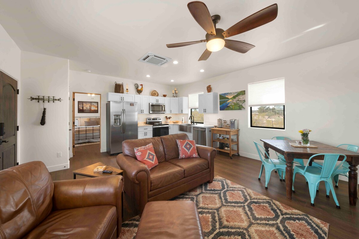 Casita del Sol Poniente is a newly built guest house in a quiet neighborhood 5 minutes from historic downtown Wickenburg. A full kitchen, separate bedroom and in unit laundry makes this a perfect getaway. With convenient access to the park and walking trails, there is something here for everyone. The front porch is a fantastic place to have a cup coffee, gaze at the mountains and watch the sunrise. But the beautiful Arizona sunsets will be worth remembering for a lifetime.