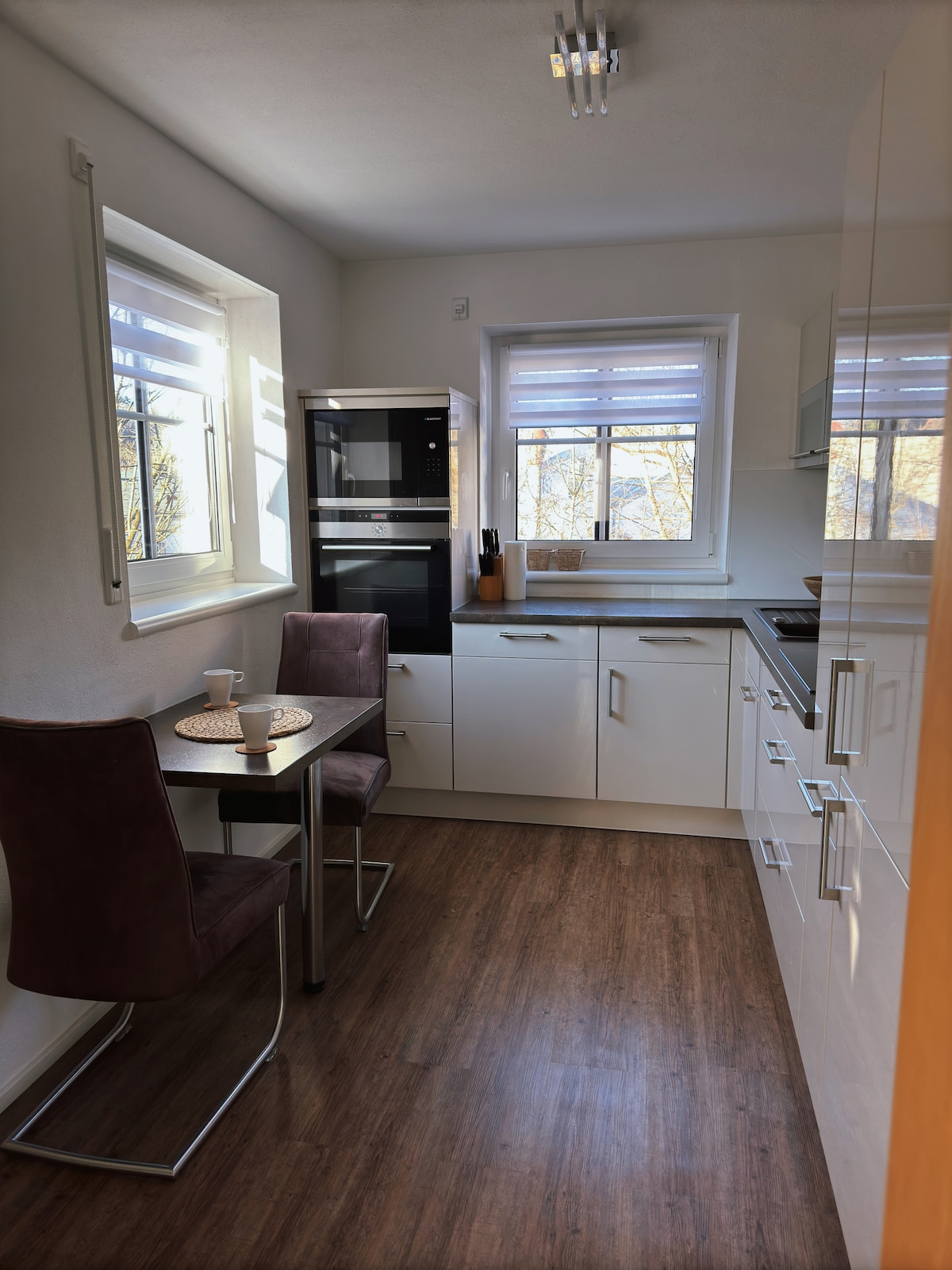 To popolnoma prenovljeno stanovanje se nahaja v odličnem stanju in se razteza v dvignjenem pritličju kmečke hiše, zgrajene v tridesetih letih prejšnjega stoletja, ki je bila vrnjena na vrh z veliko ljubezni do detajlov. Celotno stanovanje s individualnim vzdušjem vam je na voljo. Tukaj lahko dihate nemoteno! Kmetija se nahaja skoraj na odmaknjeni lokaciji (neposreden sosed), obkrožena s travniki in gozdovi v čudoviti soseski Ostallgäu.
