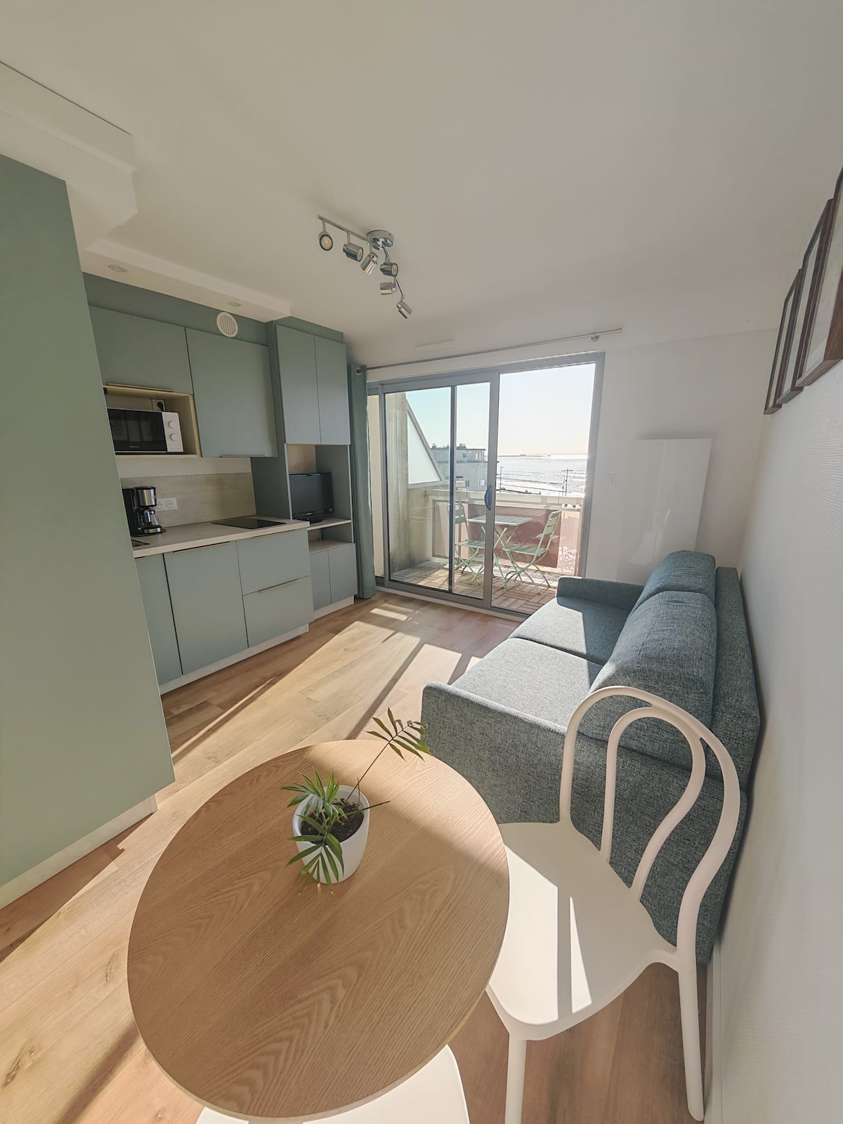 Prepustite se vzdušju, medtem ko občudujete morje, ki udobno sedi v kavču v dnevni sobi... Naše stanovanje se nahaja v 6. in zgornjem nadstropju »Grand Bleu« (dostopno z dvigalom). Ima veličasten razgled na morje, ki vam omogoča, da občudujete na eni strani svetilnika Boulogne, na drugi pa obalo Opala in angleške pečine, če je vreme blago. Dostop do plaže je neposredno ob vznožju stanovanja, z otroškim bazenom čez cesto.