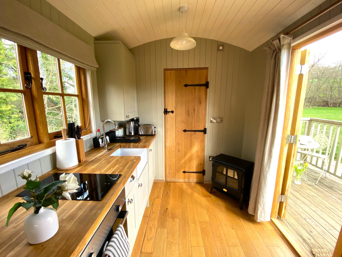 Naša ročno izdelana koča z lastno kopalnico stoji v mirnem gozdu na delujoči ovčji farmi v čudovitem Shropshiru in ponuja osupljiv pogled na dolino in gozd. To je popoln kraj za sprostitev in počitek – uživajte v prijetnih večerih ob peči na drva ali pa stopite na teraso in v popolni tišini opazujte zvezde. Slikoviti sprehodi se začnejo tik pred vašimi vrati, poleg tega pa imamo srečo, da je znameniti Offov jarek le streljaj od koče.