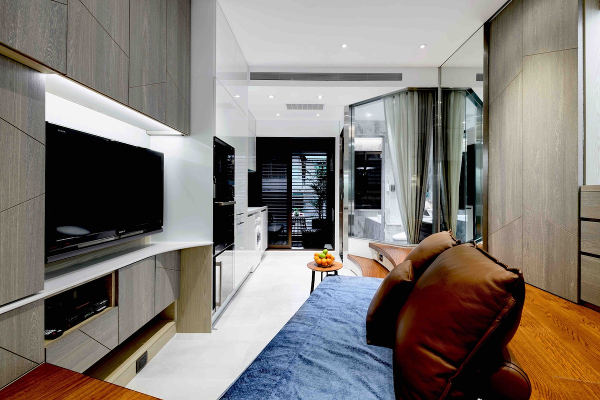 // inside // Exclusive living space: Double bed, wardrobe with storage, shower and bathroom facilities Full kitchen (dish set, condiments, microwave, IH oven, refrigerator with ice maker) Comfortable dining area/desk Living room with sofa and projector A patio with dining table and chairs // outside // Exclusive living space A courtyard with dining table and chairs // public space // 1st Floor: Gym, Social Lounge 8th Floor: Xinyi District, Taipei 101: Infinity Pool, Sky Bar Area